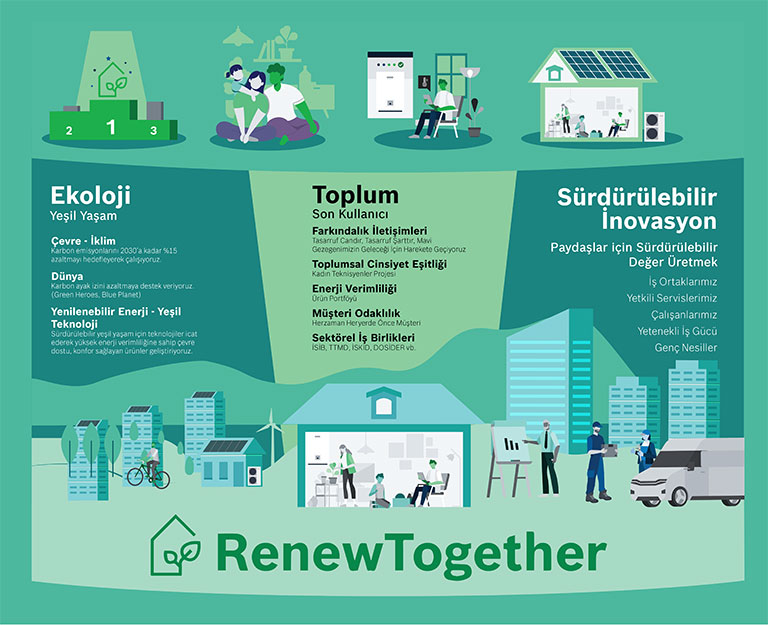 Bosch Home Comfort, “RenewTogether” platformu aracılığıyla iş ortaklarını yenilenmeye davet ederken, iş ortaklarının ve toplumun yeşil yaşamın bir parçası haline gelmesini teşvik ediyor.