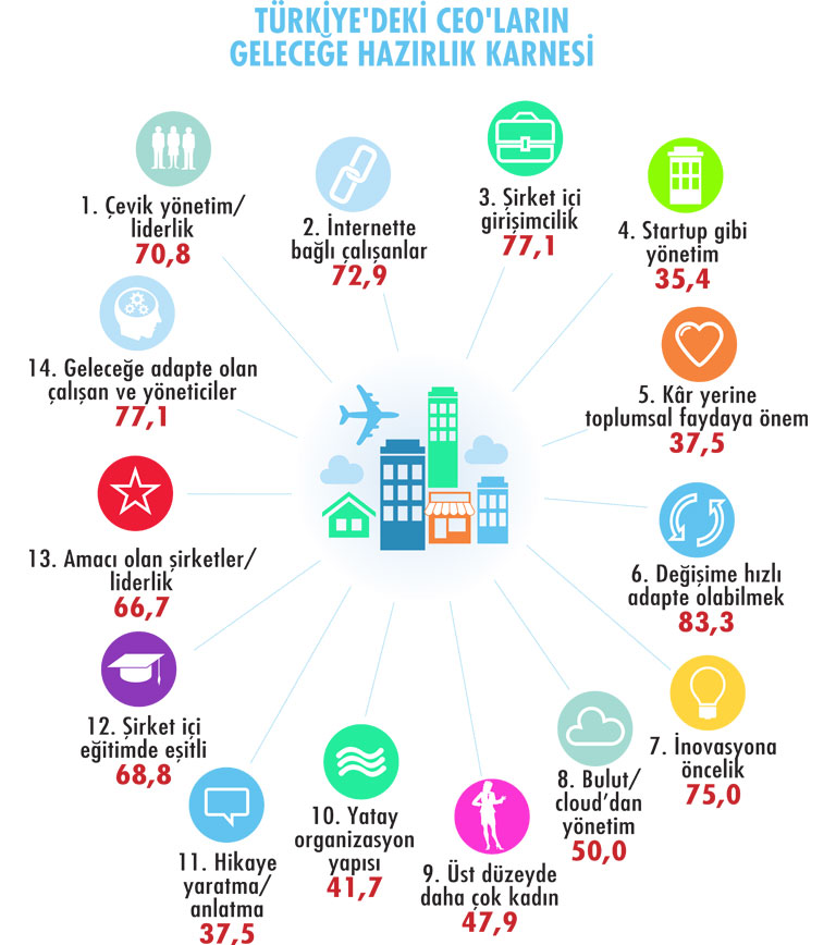 Jacob Morgan’ın 14 kriterinin Türkiye’deki karşılığını, önde gelen şirketlerin patron ve CEO’larına sorduğumuzda, ilk sırada “Adapte olmak”, “Şirket içi girişimcilik” ve “İnovasyon” gibi konuların yer aldığını görüyoruz.