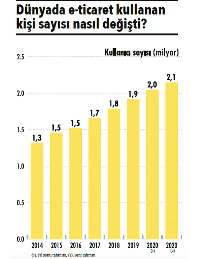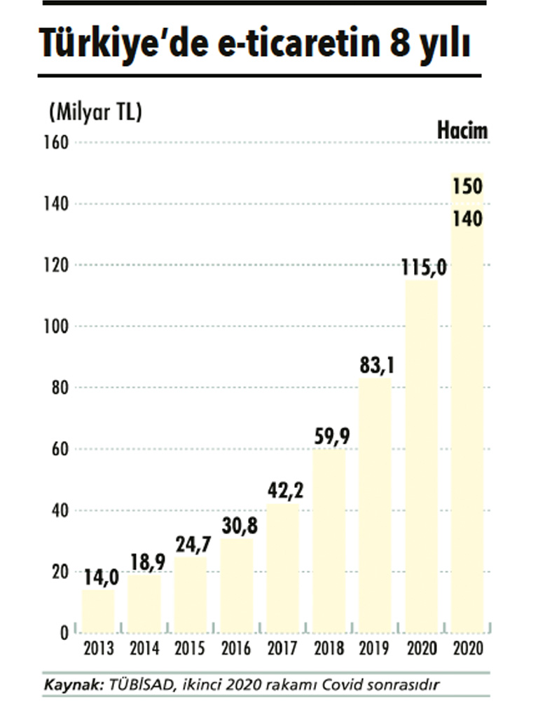 Türkiye Büyük Millet Meclisi’ne verilen bir önergeye, dönemin Gümrük ve Ticaret Bakanlığı tarafından verilen yanıtta, 2005 yılında Türkiye’deki e-ticaret hacmi 1.8 milyar TL olarak açıklanmıştı. Kaynak ise Bankalararası Kart Merkezi idi. Bu rakam, 2019 yılı sonunda 46 kat artarak 83.1 milyar TL’ye ulaştı. Eğer hayatın doğal akışı devam etseydi, yani Covid-19 salgını dünyayı sarmasaydı, 2020 yıl sonu için hedeflenen rakam 115 milyar TL düzeyindeydi.