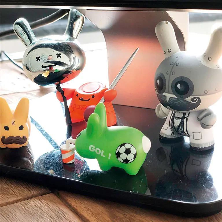 Masamdaki ekranımın altındaki Kid Robot’lar ve masamın karşısındaki duvara tırmanan adam heykeli iki favorim…
