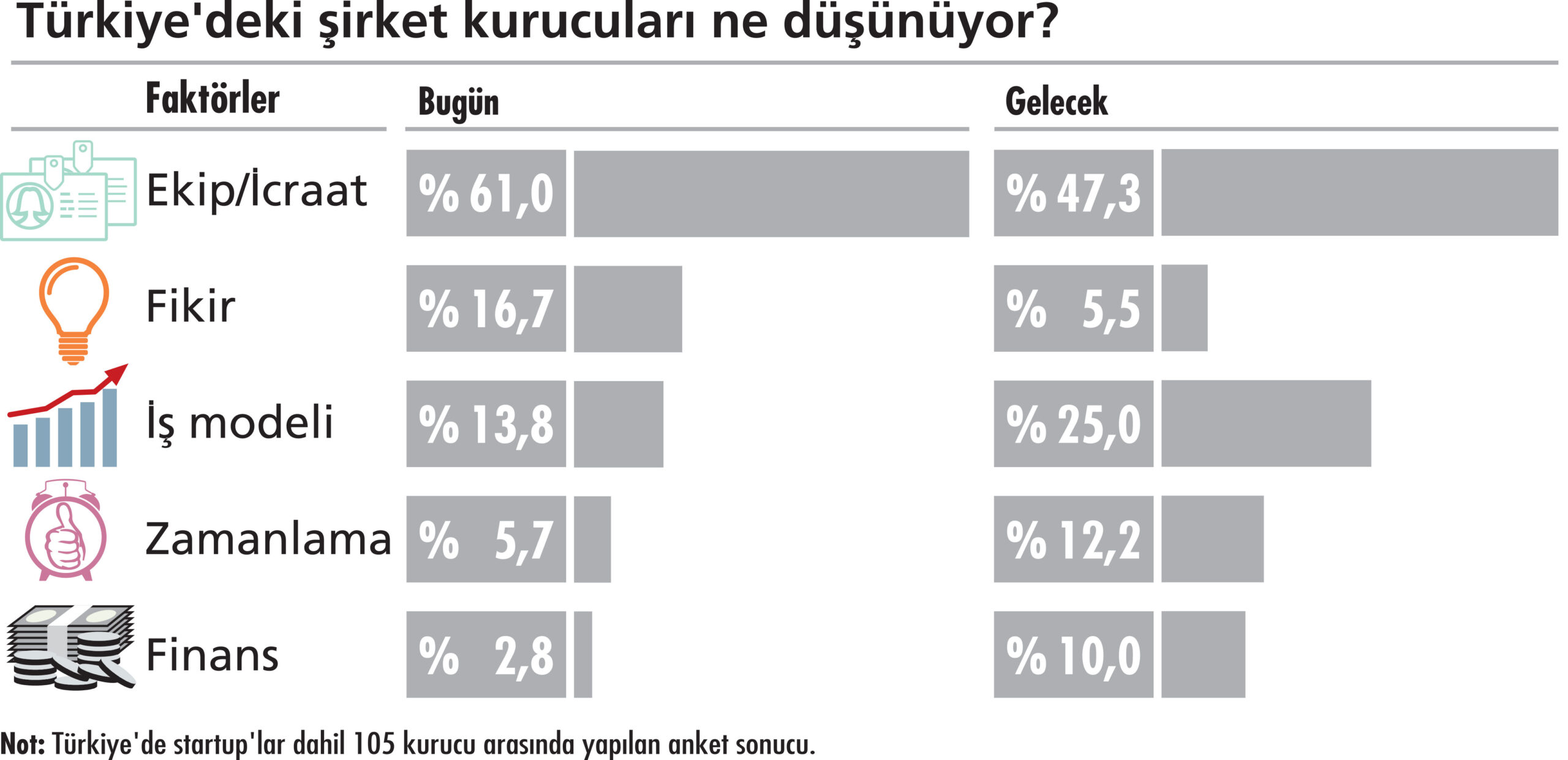 Bill Gross’un 200 girişim için yaptığı araştırmayı, Türkiye’de 105 kurucu ile gerçekleştirdik. Startup ile büyük şirket kurucularını kapsayan araştırmada, başarı faktörlerini bugün ve gelecek için değerlendirmelerini istedik. Araştırmadan çıkan ilk sonuç, yıllar önce Vehbi Koç’un dikkat çektiği gibiydi: İlk sırada yüzde 61 ile “İnsan kaynağı ve İcraat” var.