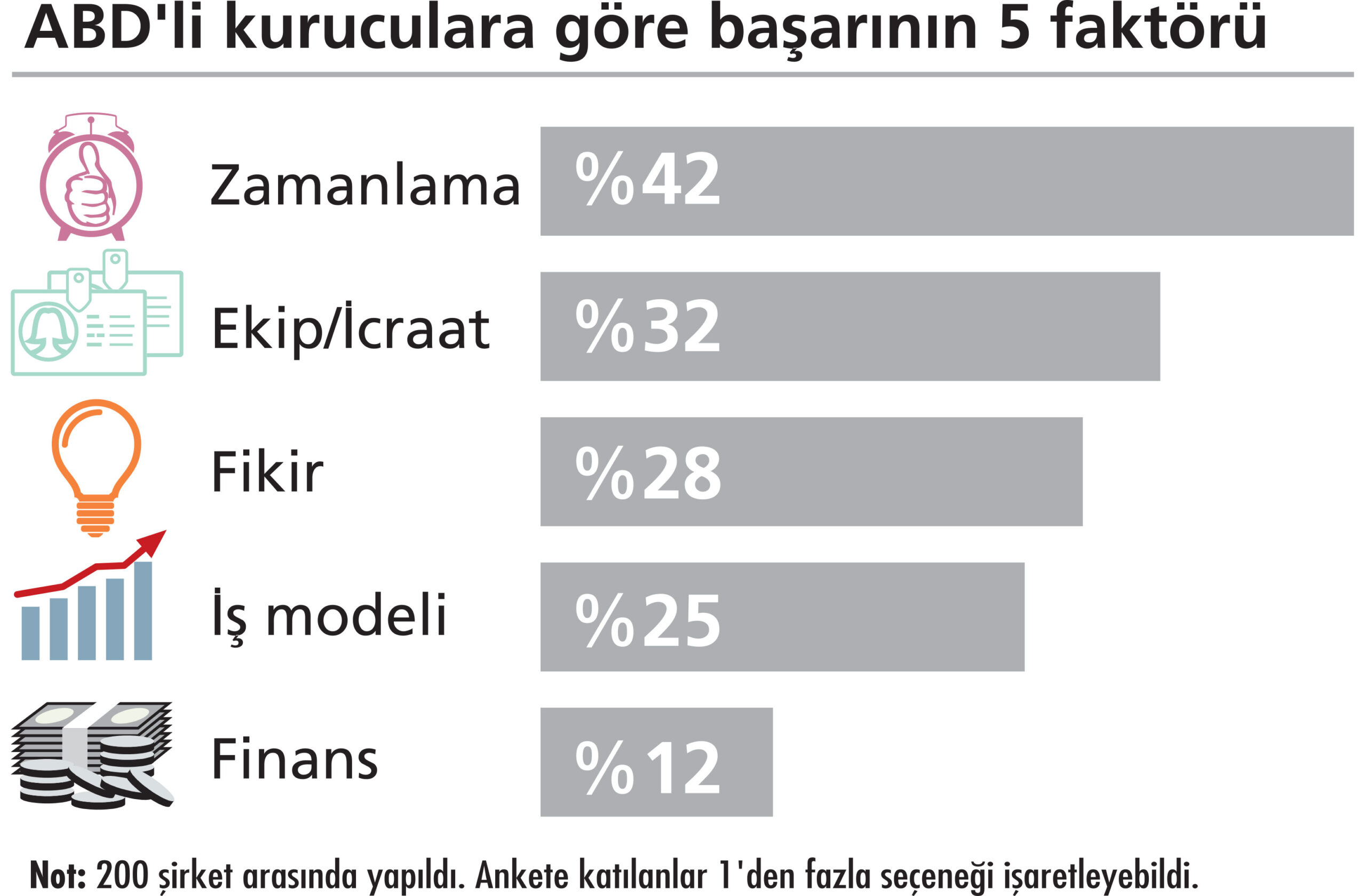 Araştırmadan çıkan sonuçlar bu sayfalardaki tablolarda yer alıyor. ABD’den farklı bir sıralama oluşmuş. Türkiye’de “Ekip” ve “Fikir” ilk sıraları alırken, orada “Zamanlama” öne çıkıyor. Amerikan girişimcileri, zamanı doğru seçtiğinde başarıya giden yolun açılacağını düşünüyor. Türk girişimcisi ise iyi insan kaynağı ile fikri hayata geçirecek “icraya” önem veriyor.