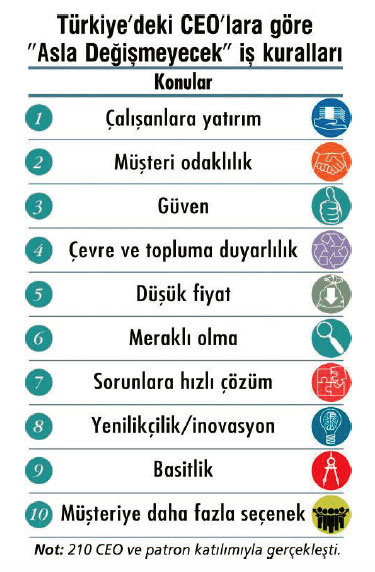 “Değişmeyen strateji” ya da “Zamansız ilkeler” diye sorduğumuzda, Türkiye’deki liderlerin yanıtları farklılık gösterse bile birkaç konu üzerinde odaklanıyor. İlk sırada ise “müşteri odaklılık” var.