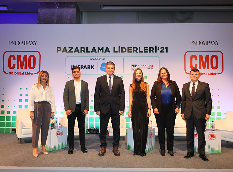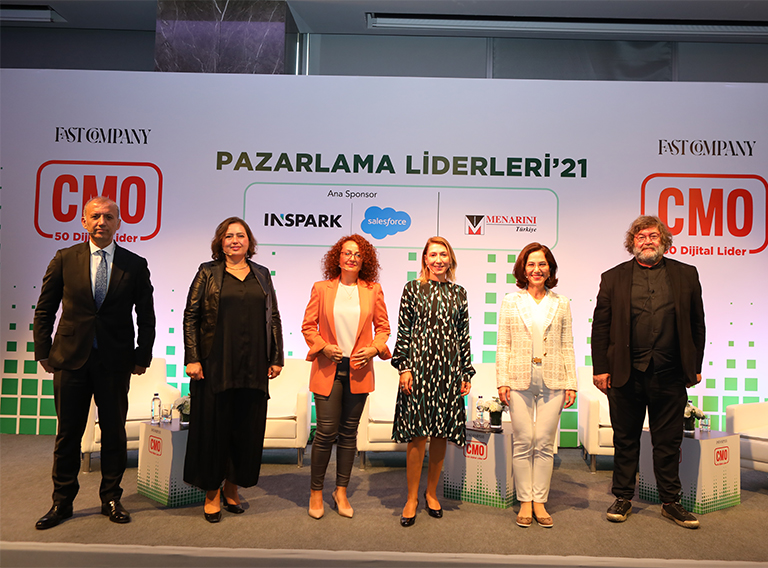 Fast Company Türkiye Yayın Yönetmeni Talat Yeşiloğlu’nun yönettiği “Teknolojiye Yön Verenler” başlıklı oturuma katılan (soldan sağa) Pınar Lafçı (Dominos Türkiye), Nazım Erdoğan (Sahibinden.com), Evren Dereci (KoçSistem), Duygu Badem Uylukçuoğlu (Vestel) ve Banu Soyak (Lenovo Türkiye) şirketlerinde uyguladıkları pazarlama stratejilerini paylaştı.