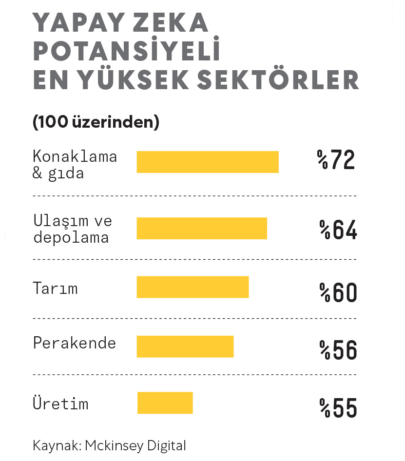 - %50: Yine Valoir’in araştırması, bazı sektörlerde işlerin önemli bölümünün otomatik hale geleceğini gösteriyor. Buna göre bilişimde yüzde 50, finansta yüzde 42, operasyonlarda yüzde 40, müşteri hizmetlerinde yüzde 38 ve satışta yüzde 37 oranında yapay zeka kullanılabilir.