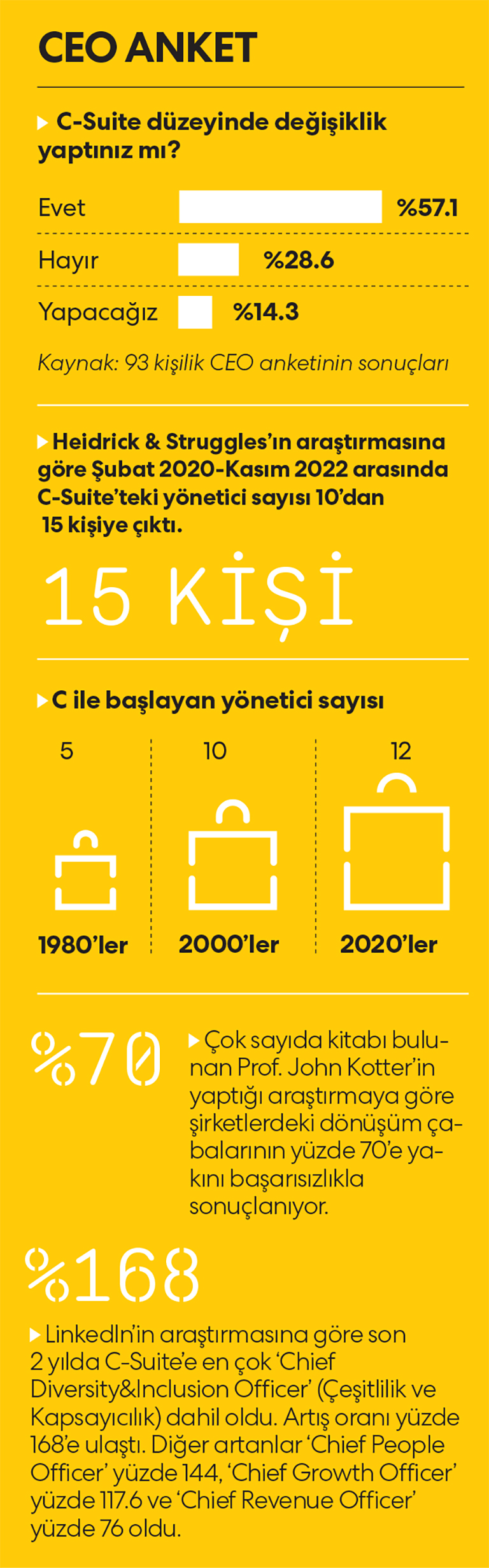 CEO’nun en çok hangi üst düzey yöneticiyle çalıştığı, ona ihtiyaç duyduğu da günümüzün C-Suite’i için önemli… IBM’in Institute for Business Value kurumu tarafından yapılan CEO anketi, bu konuda önemli mesajlar içeriyor. Araştırmaya göre, 10 yıl önce CEO’lar, “En kritik yöneticinin, gelecek 5 yılda” Chief Innovation Officer olduğunu söylemişlerdi. O dönemde yüzde 47 olan oran, 2022 araştırmasında yüzde 4’e geriledi. CMO’nun gücü yüzde 66’dan yüzde 19’a, strateji liderinin ise yüzde 67’den yüzde 6’ya düştü. Son araştırmada CTO ve CIO’nun gücü arttı. En yüksek düzeyde ise CFO ile Chief Operating Officer (COO) yer aldı.