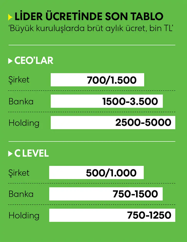 Büyük bir şirketin eski CEO’su, en çok kazanan sektörleri “Banka, Holding, Telekom” olarak sıralıyor. Bu şirketlerde aylık ücret ortalama 3.5 milyon TL, yıl sonu prim ise 100 milyon TL düzeyinde gerçekleşir. Genel müdür yardımcıları ya da direktör düzeyinde ücretler 700 bin-1 milyon TL arasında değişir. Bu grupta prim 16-20 maaşı bulabiliyor.