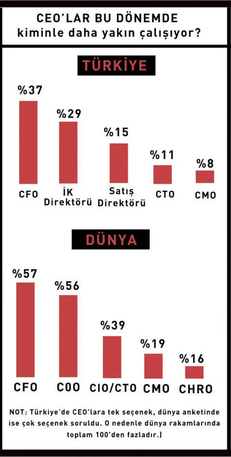 İsmini açıklamayan bir CEO ise “Özellikle bu döneme göre düşündüğümde, finans direktörünü seçiyorum. Mecburen bugünlerde daha çok parasal işlerle ilgilenmek zorundayız. Hayat normale dönünce, insan kaynaklarını öne çıkaracağız” değerlendirmesini yapıyor.