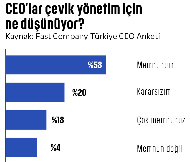 Örneğin Petrol Ofisi CEO’su Mehmet Abbasoğlu, çevik yönetimin şirketin tamamında uygulanabilirliğine inanmadıkları için en baştan hiç geçmediklerini söylüyor. “Çevik yönetim anlayışının şirket tamamında uygulanabilirliğine inanmadığımız ve kısmi uygulanması durumunda ekipler arası senkronizasyon problemi yaratma riski gördüğümüz için tercih etmedik. Piyasada birçok şirketin uyguladığı gibi sadece teknoloji ya da operasyon ekiplerine uygulayıp, şirketin kalanının konvansiyonel uygulamada kalmasını kapsayan ‘kısmi çevik yönetim’ uygulamasını istemedik. Bunun yerine şirket genelinde yeknesak ve yalın bir yönetim modeli tasarladık” diyor.