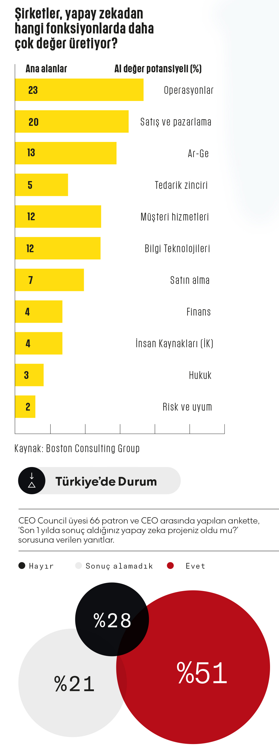 Türkiye’deki şirketlerin birçoğu hem genel yapay zekayı hem de üretken yapay zekayı verimlilik ve maliyet optimizasyonu sağlamak için aktif şekilde kullanmaya başlamış durumda. Fast Company Türkiye’nin anketine katılan 66 CEO’nun yüzde 51’i, son 1 yılda yapay zeka projelerinden sonuç alıp almadıkları sorusuna ‘evet’ yanıtını verdi. Yüzde 28’i ‘hayır’ cevabını verirken ‘sonuç alamadık’ diyenlerin oranı da yüzde 21 oldu. Aslında bu veriler, Türkiye’de yapay zeka projelerinin, uygulanmasına rağmen hâlâ etkili sonuç alma konusunda tam bir başarı sağlanamadığını gösteriyor.
