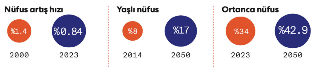 - “Ortanca yaş”, 2023’teki 34’ten 2050’de 42.9 yıla yükselecek.