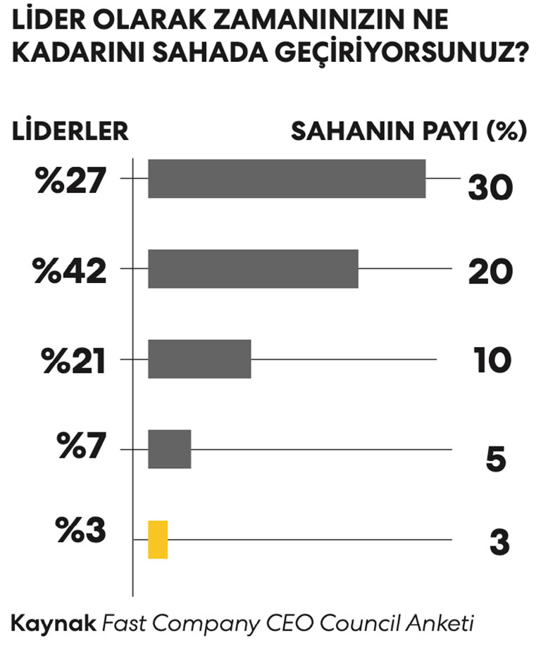 Türkiye’de CEO’lar arasında yaptığımız anketin sonuçları da sahada çalışmanın önemini ortaya koyuyor. Buna göre, CEO’ların yüzde 42’si zamanının yüzde 20’sini sahada geçirdiğini belirtiyor. Katılanların, yüzde 27’si sahada geçirilen zaman miktarı için yüzde 30 bilgisini veriyor. Yüzde 21’lik kesim ise yüzde 10 düzeyinde zaman ayırdıklarını paylaşıyor.