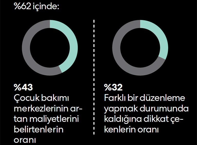 Çocuk bakımı, Mart 2020’den önce de ne ucuzdu ne de kolay bulunuyordu. Fakat Care.com’un analizine göre, ebeveynlerin yüzde 72’si 2021’de çocuk bakımının pandemi nedeniyle daha pahalı hale geldiğini söylüyor. Üstelik çocuk bakımı merkezlerinin üçte biri hâlâ kapalı. Bu durum ebeveynleri, özellikle de anneleri işgücünden uzaklaşmaya veya tamamen ayrılmaya mecbur bıraktı. Bazı şirketler işgücündeki bu seyrelmeyi sınırlandırmaya çalışmak amacıyla yan hakları iyileştiriyor, çalışanlara yedek bakım olanağı sunuyor, eğitim masraflarını karşılıyor veya şirkette çocuk bakım hizmeti sağlıyor.