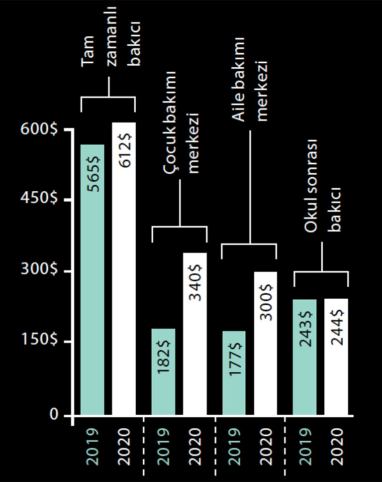 Ulusal ölçekte, haftalık ortalama çocuk bakımı maliyetlerinin 2019 ve 2020 karşılaştırması (çocuk başına)