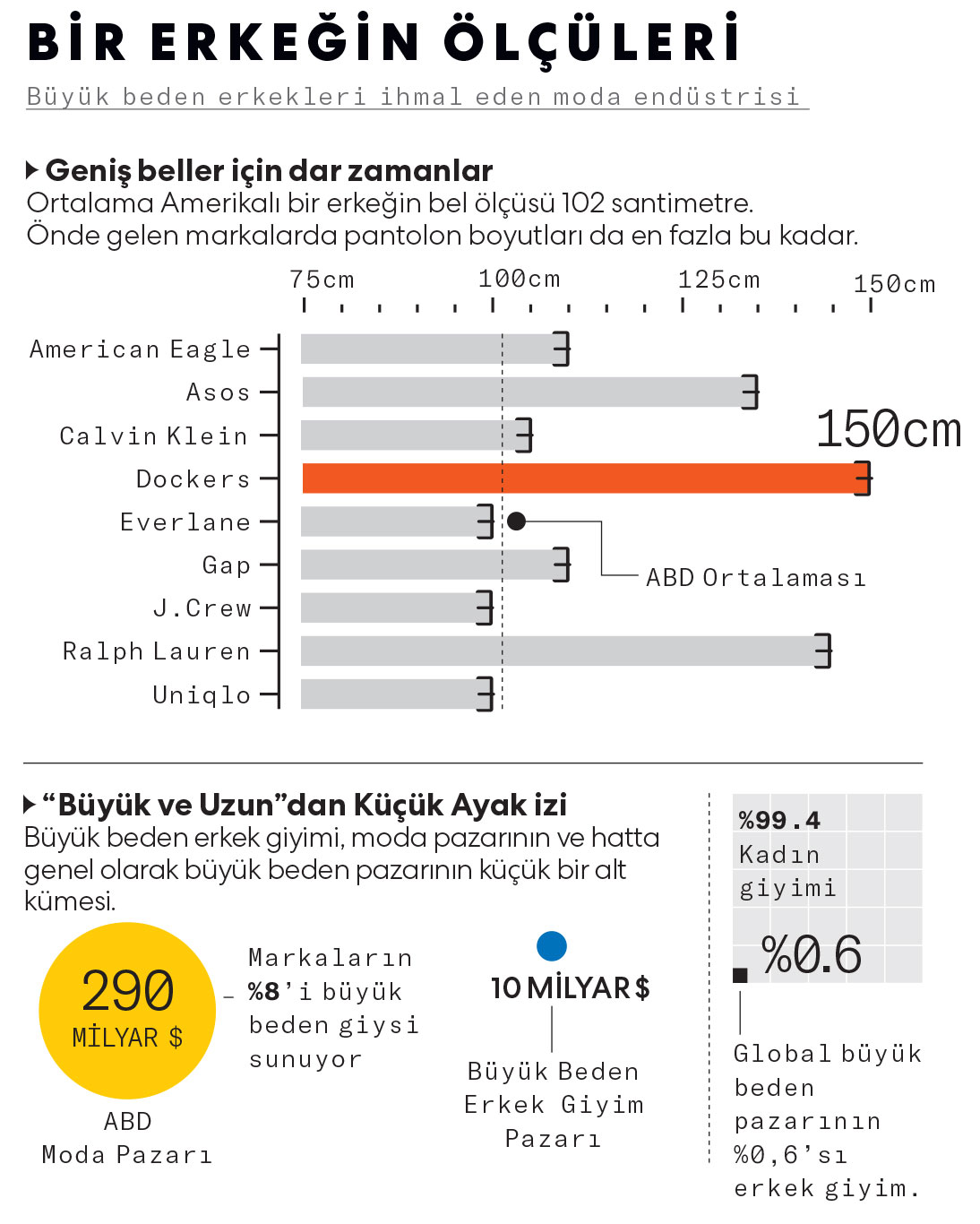 Büyük beden kadınlar, ciddiye alınmak için moda endüstrisini zorlamak zorunda kaldı. Gösterişli dergiler uzun süredir gerçekçi olmayan sıska modelleri yüceltiyordu ve kadın giyim markaları, ortalama bir kadın bile 14 bedenken 12 bedeni geçmeyi reddediyordu. On yıl önce, Gabi Fresh ve Nicolette Mason gibi influencer’lar, beden kapsayıcılığı/olumlama hareketinin başlamasına yardımcı oldular; modaya uygun kıyafetler giyerek ve fotoğraflarını paylaşarak muazzam takipçi topladılar. Bu durum kadınları, markalardan kendi bedenlerinde giysi talep etme konusunda güçlendirdi ve zamanla çoğu marka buna uydu. Ancak erkek tüketicilerden benzer bir tepki gelmedi. Büyük beden kadın giyim girişimi olan Dia&Co’nun kurucusu ve CEO’su Nadia Boujarwah, “Erkeklerin hayatın pek çok alanında kendilerini bu kadar rahat savunabilmeleri etkileyici; ama burada değil” diyor.