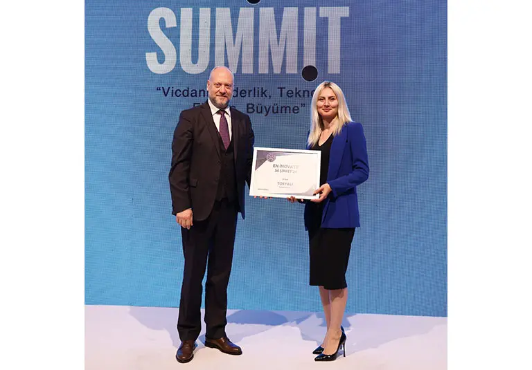 Tosyalı Holding’in CMO’su Selda Çelik, kurumun ödülünü Cüneyt Erpolat’tan aldı.