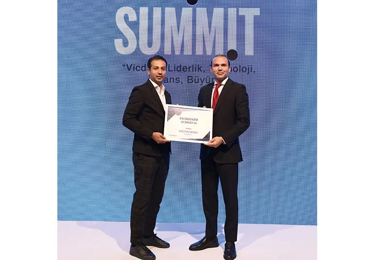 Araştırmada ilk 10’de yer alan şirketlerden Erciyas Holding CEO’su Emre Erciyas, ödülünü MechSoft’un CEO’su Gökhan Erdoğan’dan aldı.