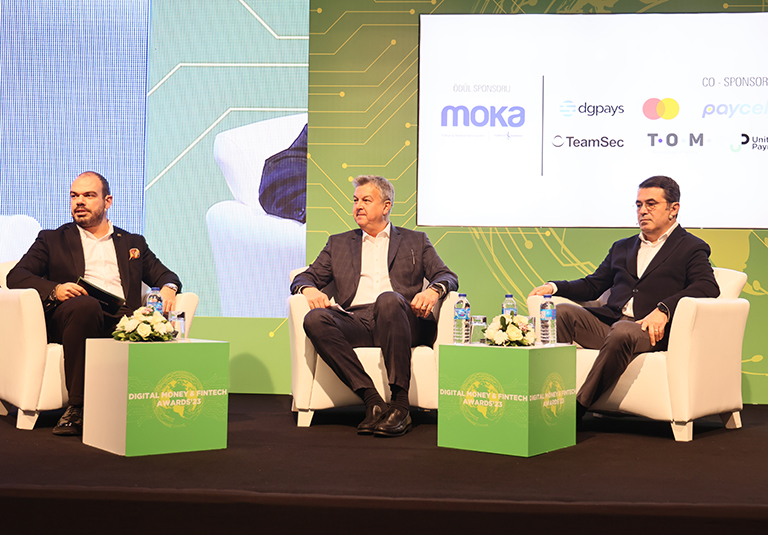 Mehtap Demir’in yönettiği “Yeni Dönem Hesapları” başlıklı panelde (soldan sağa) Nezih Sipahioğlu (Sipay), Murat Kastan (UPT) ve Esad Erkam Köroğlu (TeamSec), şirketlerinin yeni dönem hedeflerini paylaştı.