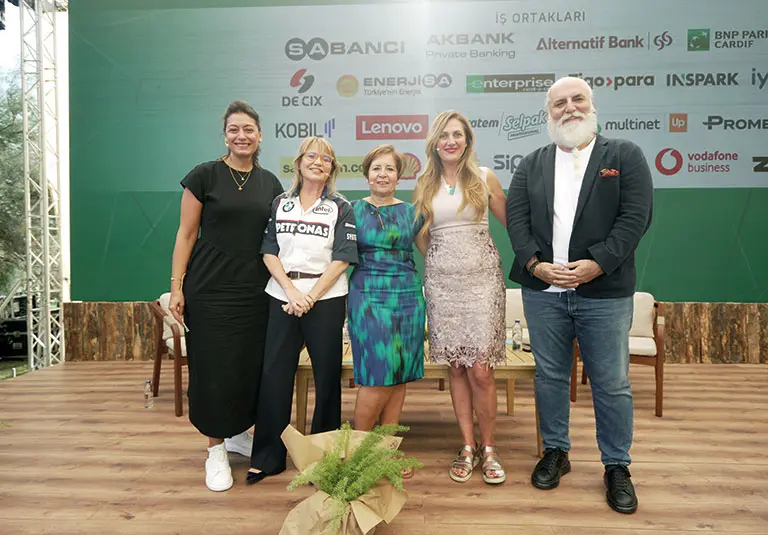 Değişen koşullarda iş yapış şekillerinin konuşulduğu “Zor Zamanda Liderlik” oturumunda (Soldan sağa) Burak Ertaş (Sahibinden.com), Yeşim Özlale Önen (Sabancı Holding), Oya Şener (Fiba Perakende), Jaklin Güner (Vakko) ve Gökçe Şenocak (Prometeon) görüşlerini paylaştı.