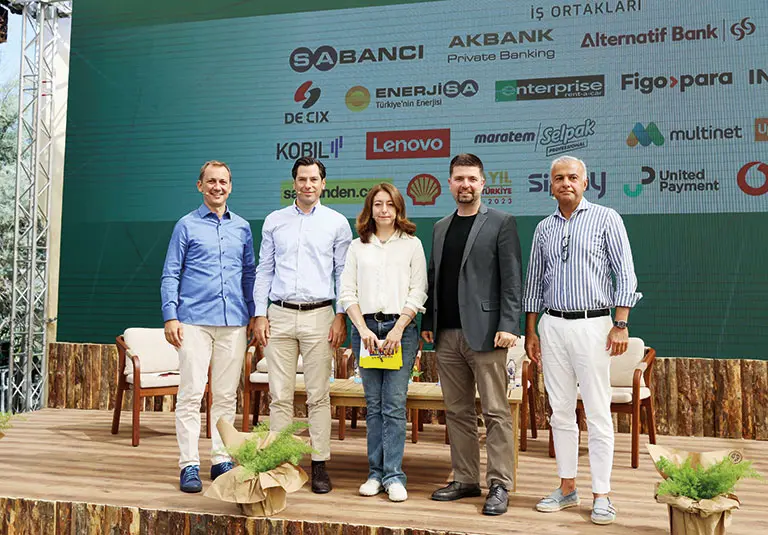 “Dünyayı İyileştirenler” oturumunda (soldan sağa) Emre Hantaloğlu (Lenovo Türkiye), Ahu Serter (Fark Labs), Dünya Tangün (Gen Z Üyesi), Murat Pınar (Enerjisa) ve Selim Kervancı