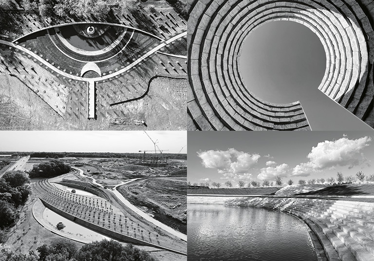 YAĞMUR SUYU ALTYAPISI TİPİK OLARAK fayda sağlamakla ilgilidir, yani tasarım olarak şekline değil, işlevine bakılır. Ancak Omaha, Nebraska’daki inşaat halindeki yeni bir karma kullanımlı geliştirmede, halk sanatı olarak da işlev görüyor. 14 büyük, heykelsi kireçtaşı havzasından oluşan bir seri, 55 milyon galona kadar suyu saklayabiliyor (bu miktar 55 adet büyük belediye su kulesine eşdeğer) ve su kuleleri gibi, sel kontrol sisteminin gizlenmesi amaçlanmıyor. 500 dönümlük tesis, sel riski altındaki bir havzada bulunuyor; sadece 2019’da, Nebraska afet taşkınlarından 3 milyar dolarlık zarara uğramıştı. Geliştirici olan Applied Underwriters Insurance, halkın doğaya daha fazla erişimini sağlamak ve havzaları da içinde barındırmak üzere 158 dönümünü yeşil alana ayırdı. Applied Underwriters kurucusu ve başkanı Steve Menzies, “Çoğu geliştirici, alanın her bir metrekaresinde bina inşa ederken, biz dikkatli bir şekilde onu korumak için kolları sıvadık,” diye konuşuyor.
