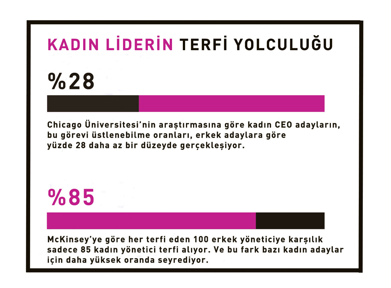 Bu gerçeği, ABD’nin en büyük 500 şirketi listesindeki kadın CEO sayısının 41 ile tüm zamanların en yüksek düzeyine ulaşmasına rağmen; oranın hâlâ sadece yüzde 8’de kalması da doğruluyor. ABD’nin 3 bin şirketinde kadın CEO oranı ise sadece yüzde 6 düzeyinde seyrediyor.