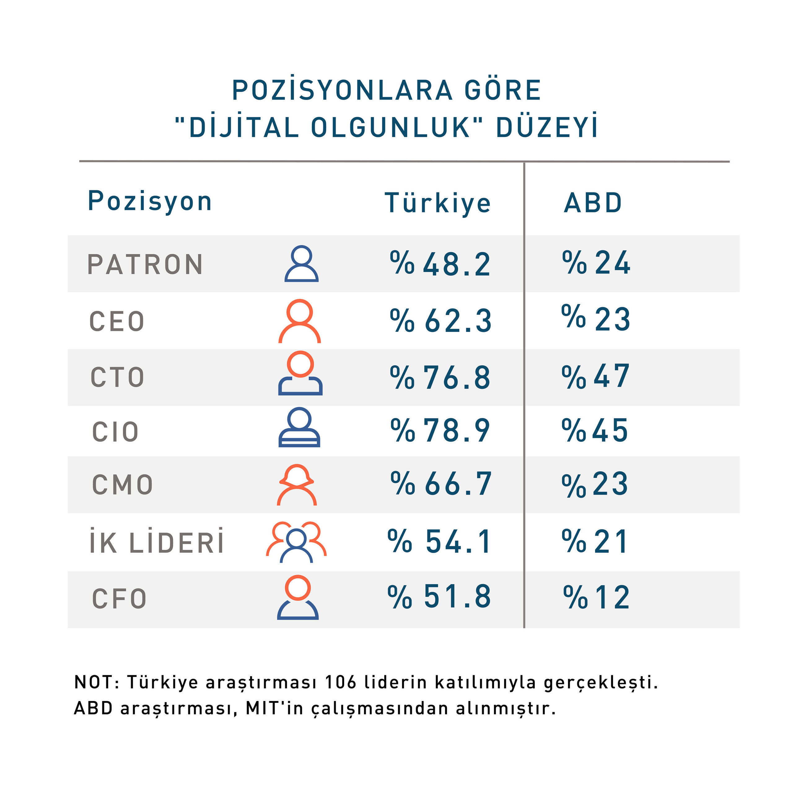 Türkiye’deki duruma baktığımızda araştırmaya paralel sonuçlar olduğunu görüyoruz. Bu konudaki son durumu ortaya koyan araştırmayı 106 şirketin liderinin katılımıyla ortaya koyduk. Patron ve C düzeydeki yöneticilerin katıldığı araştırmadan, Türkiye’deki liderlerin tahmini “dijital anlayış” ve “olgunluk” düzeyi öne çıktı. Liderlerin değerlendirmelerine göre en kötü durumda yüzde 48.2 ile “patronlar/başkanlar” yer aldı. İşleri gereği dijitalleşmeye en hakim grup olan CIO’lar yüzde 78.9 ile ilk sıraya oturdu.