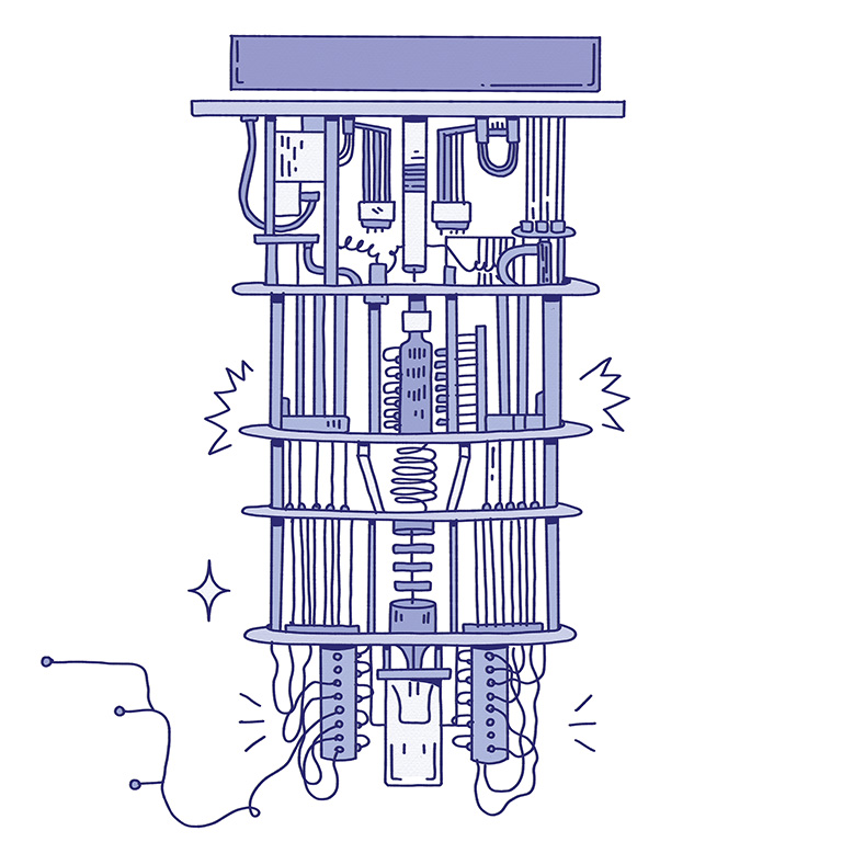 Kuantum bilgisayarlarda, kuantum biti (ya da qubit), bu özelliklerden faydalanıyor. Geleneksel bir bit, bir veya sıfır içeren ikili bir durumdayken, bir kübit bir, sıfır veya bu ikisinin arasındaki herhangi bir durumda olabilir. Dolanıklık kübitleri, birlikte çalışarak, algoritmaların birden fazla kübiti manipüle etmesine izin veriyor, böylece birbirlerini etkiliyorlar ve geniş, basamaklı bir hesaplamalar dizisi başlatıyorlar. Bu akıl almaz özellikler, kuantum bilgisayarların gücünün temeli. Fakat kuantum fiziğini ehlileştirmek, bilim insanlarının şimdiye kadar üstlendiği en göz korkutucu görevlerden biri. Kübitlerin kuantum durumlarını koruyabilmek için bunların pek çoğunu mutlak sıfırın birazcık üstündeki bir dereceye kadar soğutmak gerekiyor. Bu gereklilik, makinelerin buharlı makineler döneminden kalma avizelere benzeyen eşsiz görüntüsüne yol açıyor. Sıklıkla altın kaplı bakırdan imal edilen ve havada asılı duran bir yığın disk, sıcaklığı devamlı olarak düşürüyor ve birbirine dolanan kablolar da kübitlerin içine ve dışına veri taşıyor.