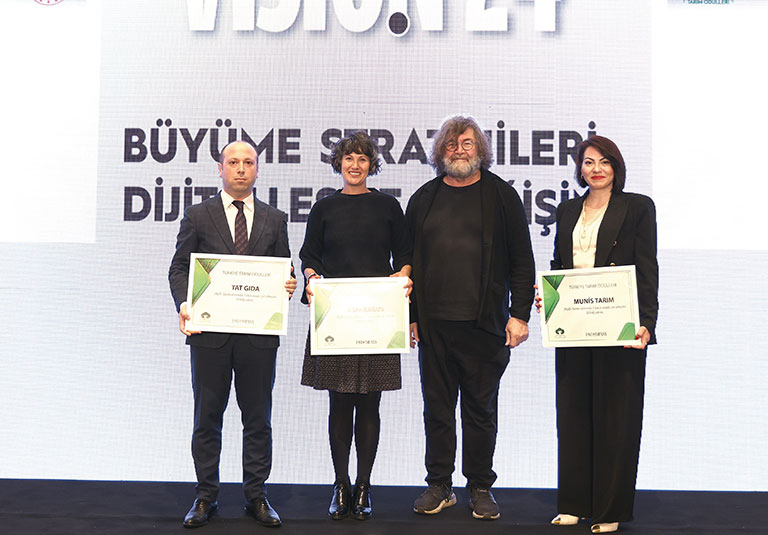 ‘Akıllı Tarım’ kategorisinde sıralamaya girenler 3 şirketin yöneticileri (soldan sağa), Ahmet Boz (Tat Gıda), Aslı Aksoy (Asparagus) ve Burcu Arslan (Munis Tarım), Next Akademi kurucusu Levent Erden’den ödüllerini aldı.