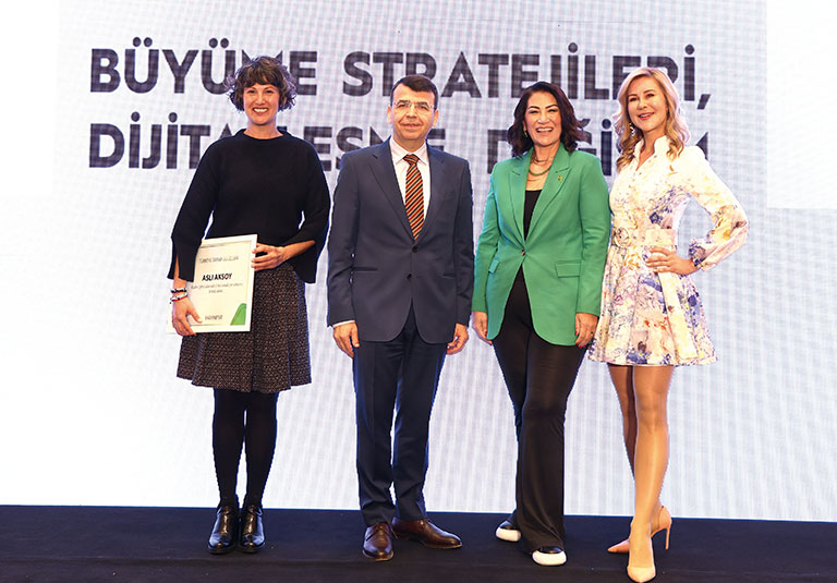 ‘Sürdürülebilirlik’ kategorisinin kazananları, Aliağa Biskivilik Tohum (Yıldız Holding) ve Mey Diageo’nun oldu. (Soldan sağa) Süheyl Aybar (Yıldız Holding), Güldeniz Ayral, Senem Günay (Mey Diageo) ve Altuğ Ünivar (Mey Diageo).