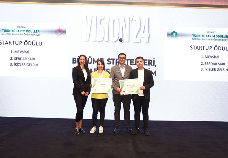 Yarışmanın ‘StartUp’ kategorisinin kazananları Mevsimi ve İkizler Kalıp oldu. (Soldan sağa) Cansu Çebi (Vodafone), Alara Yeğen (Mevsimi), Mustafa Arap ve Ali Doyran (İkizler Kalıp)…