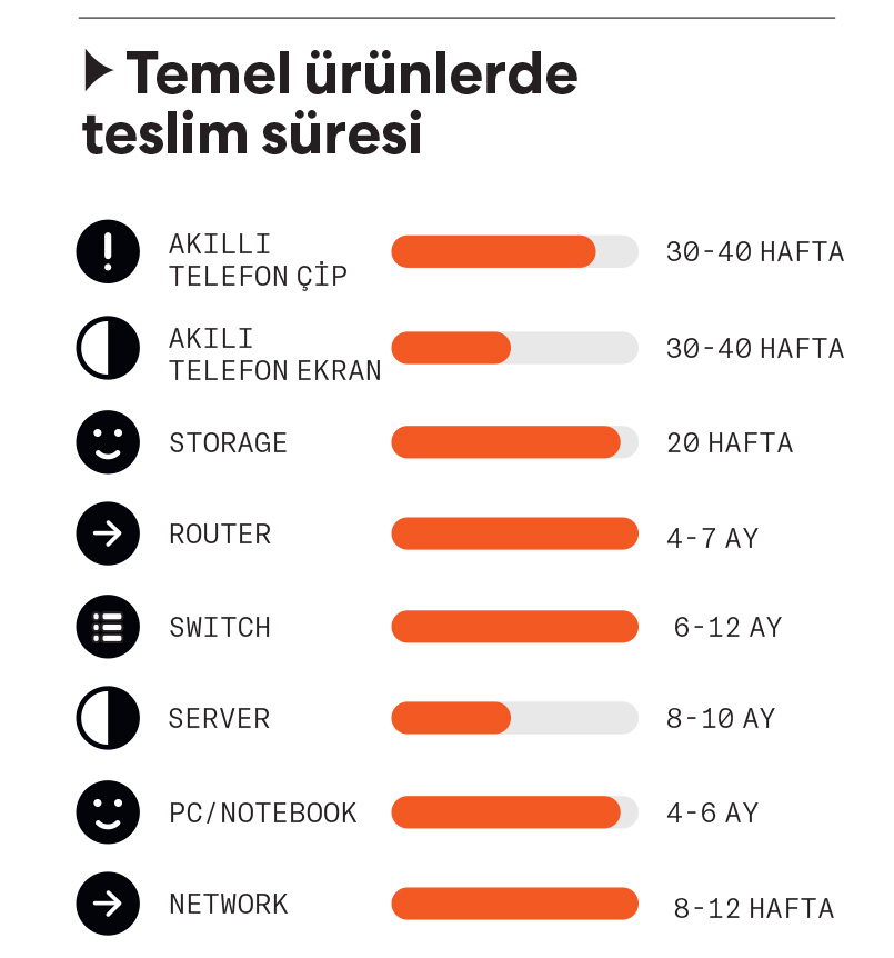TrendForce tarafından hazırlanan raporlar, Kasım 2021’den itibaren iyileşme olsa da dünyada teknoloji tedarikinde sürelerin hâlâ çok uzun olduğunu ortaya koyuyor. Rapora göre, PC ve notebook için gerekli parçalar/ekipmanlar (çip dahil) ancak 8-12 haftada tedarik edilebiliyor. Ancak bazı cihazlarda/ekipmanlarda, örneğin LAN (local area network) server’ları için gerekli çiplerde süre 40 haftaya kadar ulaşıyor. Raporda, bu sürenin pandemi döneminde 50 haftaya çıktığının altı çiziliyor. Benzer şekilde akıllı telefonların bazı kritik ekipmanlarında 30-40 hafta gerekiyor. Ekranlarda ise 20-22 hafta bekleniyor. TrendForce, bu nedenle akıllı telefon satışlarının 2022 ilk çeyrekte yüzde 13 düştüğüne dikkat çekiyor.