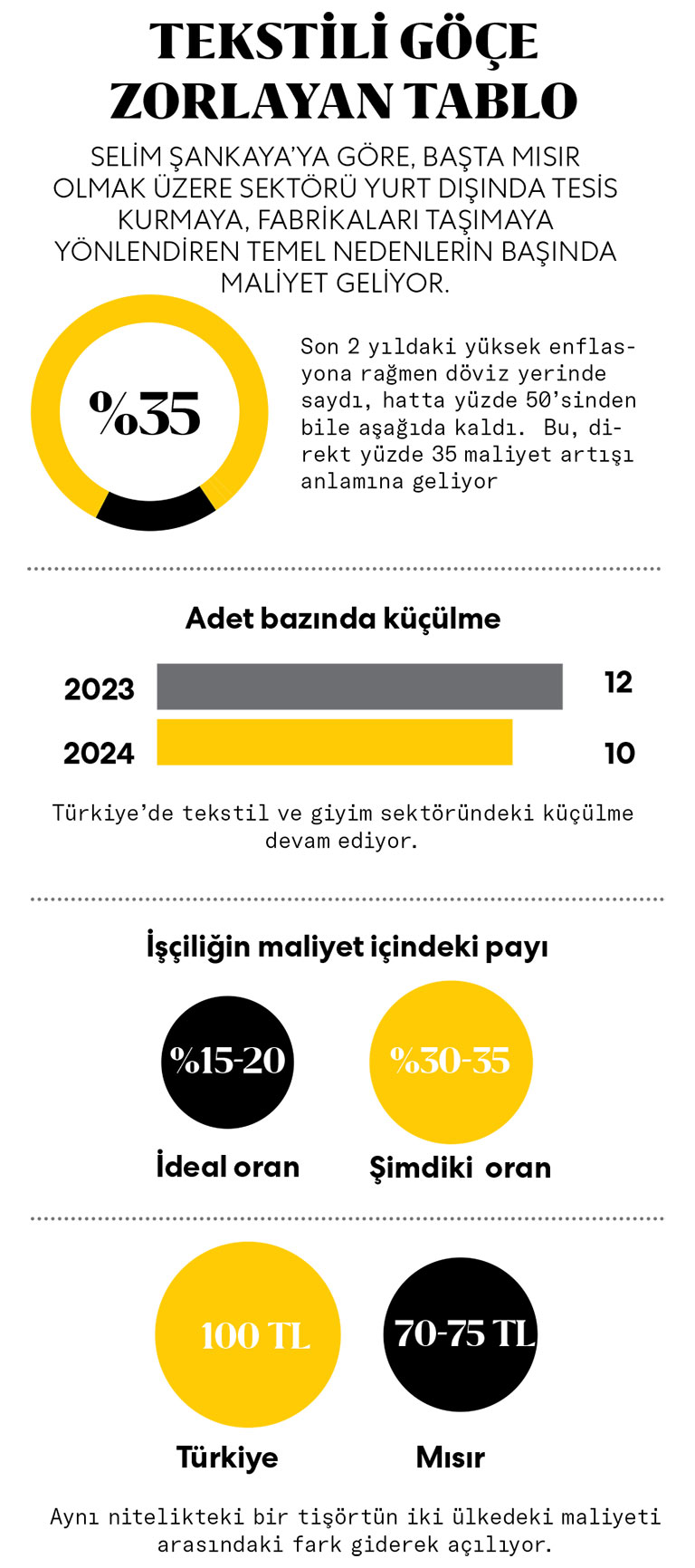 Ona göre, Mısır’a yatırım yapılmasaydı, global firmalar Türkiye’den alım yapmayacaklardı. İki taraftan da üretim yapılabildiği için alıma devam ettiler. Yurt dışında tekstil ve giyim üretimini yıllar önce keşfeden Selim Şankaya, tekstilin performansından, sektördeki üretimin yurt dışına kaymasına kadar önemli konularda görüşlerini paylaştı.