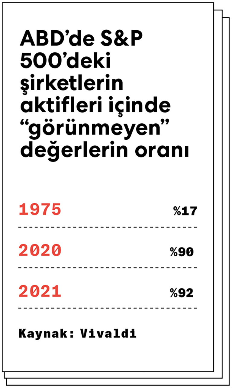 Colin Mayer, Prosperity adlı kitabında paylaştığı tek bir istatistikle şirketler dünyasının doğasının nasıl değiştiğini ortaya koyuyor. Mayer, 1970 ve 2018 yıllarına ait 500 büyük şirket listesine giren şirketlerin bilançolarından aktiflerini analiz ederek önemli bir saptama yaptı. Buna göre 40 yıl önce bu şirketlerinin piyasa değerlerinin yüzde 80’i “fabrika, makine ve bina” gibi elle tutulabilir aktiflere aitti. Geri kalan yüzde 20 ise lisans, patent, marka ve geliştirmelerden kaynaklanıyordu. Mayer, 2021 sonu itibarıyla 500 büyük şirketin değerinin yaklaşık yüzde 85’inin görünmeyen değerlerden kaynaklandığını hesaplıyor.