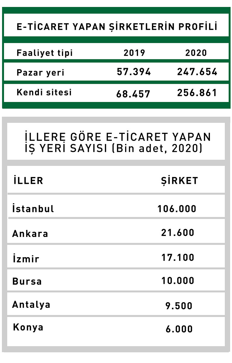 Ticaret Bakanlığı’nın verilerine göre, rakamlar düşük olsa dahi, 2020 yılında e-ticaret satışında en büyük artış şu illerde görüldü: Hakkari, Muş, Kırşehir, Bitlis ve Yozgat. Dünyada yükselen trend ve pandeminin etkisi de e-ticaretin bütün illere yayılmasına, bu alana yönelik şirketlerin kurulmasına katkıda bulundu. İstanbul Ticaret Odası (İTO) Başkanı Şekib Avdagiç’in paylaştığı bir rakam bu görüşü destekliyor:
