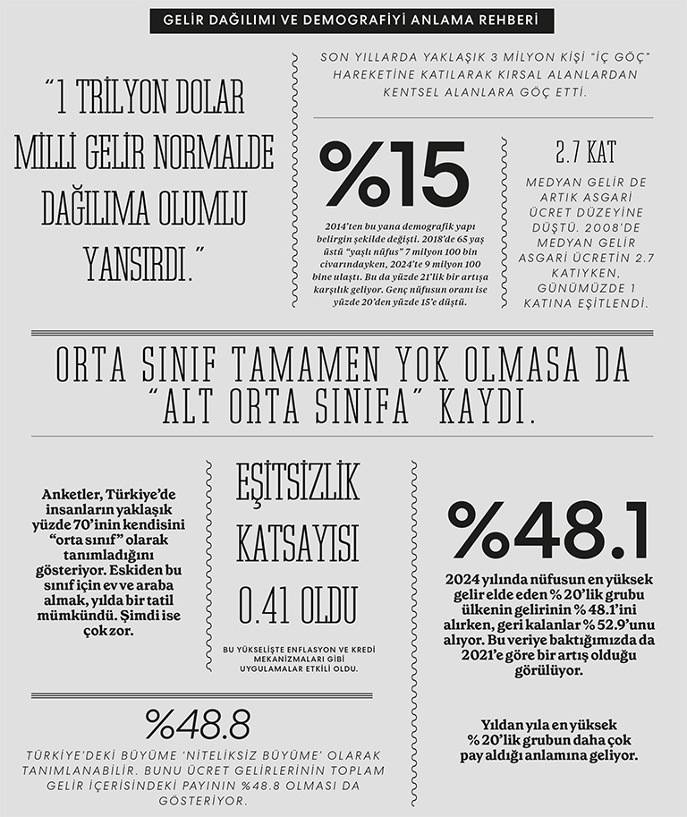 “Türkiye’nin 1 trilyon dolardan fazla ekonomik büyüklüğe ulaşması normalde gelir dağılımına olumlu yansırdı. Normal koşullarda büyüme adil dağıtılırsa refah artışı sağlar. Ancak Türkiye’de kaynakların dağılımı adaletsiz olduğu için büyümenin gelir dağılımına etkisi sınırlı kaldı. Gelirler artsa da en zengin kesim daha çok kazandı, orta sınıf reel gelir kaybı yaşadı.”