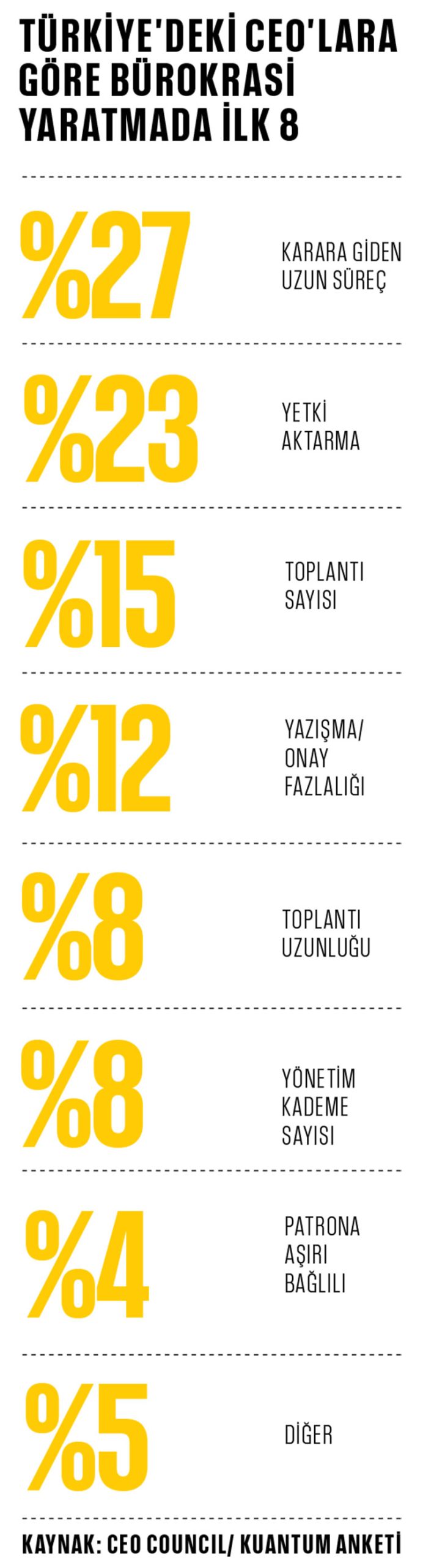 Türkiye’nin önde gelen CEO’larının/başkanlarının katıldığı CEO Council anketinde, “Şirketinizde bürokrasi bir sorun mudur?” sorusuna “Evet” yanıtını verenlerin oranı yüzde 46 olarak belirlendi. Aynı ankette, en önemli sorun olarak ise “yetki aktarımı” öne çıktı. Ardından ardı arkası kesilmeyen “verimsiz” toplantılar geldi.