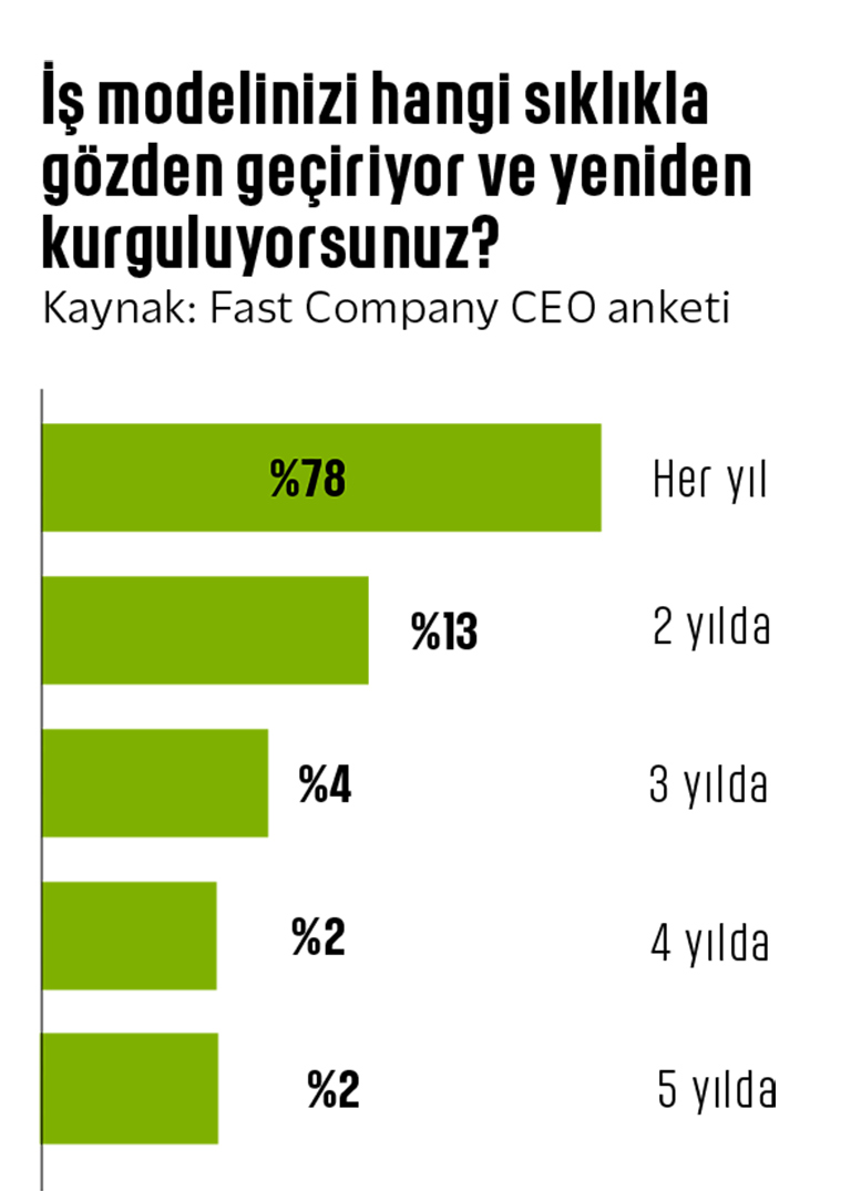 Türkiye’deki iş liderlerinin görüşleri, iş modellerinin düzenli olarak gözden geçirilmesi ve yeniden oluşturulmasının önemini vurguluyor. Fast Company CEO anketine katılan 45 CEO’dan 35’i, iş modellerini “her yıl” gözden geçirdiklerini belirtirken, diğerleri 2 ila 5 yıl arasında değişen oranlar paylaşıyor. Bu, sürekli yenilik ve dönüşüm gerekliliğini açıkça ortaya koyuyor.