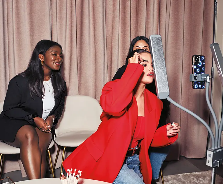 Gomez, yeni bir kaş jelini tanıtmak için topluluk etkileşimi yardımcı yöneticisi Duchess Dankwah ve sosyal medya içerik koordinatörü Emily Ceja ile canlı bir TikTok videosu çekiyor.