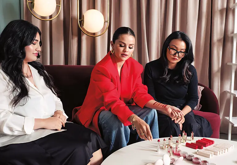 Gomez, ürün geliştirme direktörü Angela Grigoryan (solda) ve ürün baş sorumlusu Joyce Kim ile yeni Rare Beauty ürünlerini inceliyor.