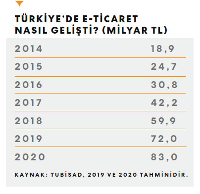 Hepsiburada (1998) ve Gittigidiyor’un (2001) öncülerinden olduğu pazar, internet ve dijital teknolojilerin gelişimiyle son yıllarda büyük bir ilerleme kaydetti. Türkiye Bilişim Sanayicileri Derneği (TÜBİSAD) ve Deloitte işbirliğiyle yayımlanan “Türkiye E-Ticaret Pazar Büyüklüğü” raporuna göre, 2018 yılı itibarıyla pazar, perakende dışı işlemler için 28.4 milyar TL, perakende işlemleri için 31.5 milyar TL olmak üzere 59.9 milyar TL büyüklüğe ulaştı. 2018 yıllık büyüme değerlerine bakıldığında TL bazında yüzde 42’lik, dolar bazında yüzde 7’lik bir büyüme var. TÜBİSAD Başkanı Erman Karaca, Türkiye’de son 5 yıla baktığımızda e-ticaret hacminde ortalama yüzde 33’lük bir büyüme gördüğümüzü belirtiyor ve ekliyor:
