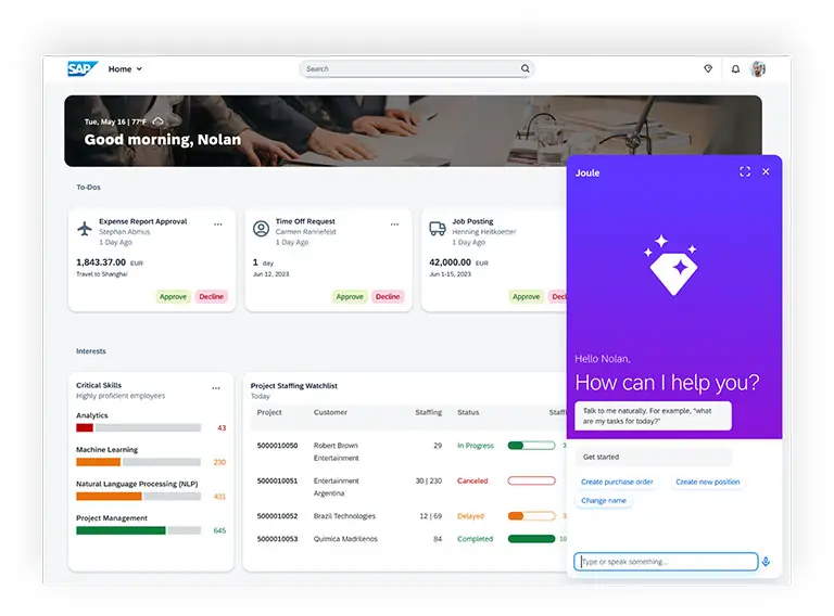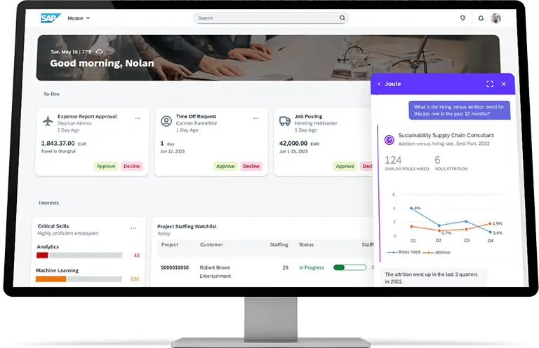 Örneğin bir üreticinin satış performansını daha iyi anlamak için Joule’den yardım istediğini düşünün. Joule, düşük performans gösteren bölgeleri belirleyebilir. Üreticinin incelemesine yönelik potansiyel düzeltmeler sunmak için, bir tedarik zinciri sorununda, ortaya çıkan diğer veri kümelerine bağlantı verip otomatik olarak tedarik zinciri sistemine bağlanmanızı sağlayabilir. Tüm SAP çözümleri için sürekli olarak yeni senaryolar sunacak olan Joule, İK alanında da tarafsız iş tanımlarının yazılmasına ve amaca uygun mülakat soruları oluşturulmasına yardımcı olacak.