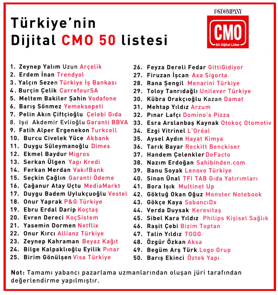 Teknolojiyi işinin odağına koyan, başarıyla uygulayan pazarlama liderlerini bir araya getirmeyi amaçlayan Digital CMO 50 listesi Fast Company dergisi tarafından açıklandı. Türkiye’de ilk defa düzenlenen liste, tamamı global isimlerden oluşan pazarlama uzmanı/liderleri tarafından belirlendi.